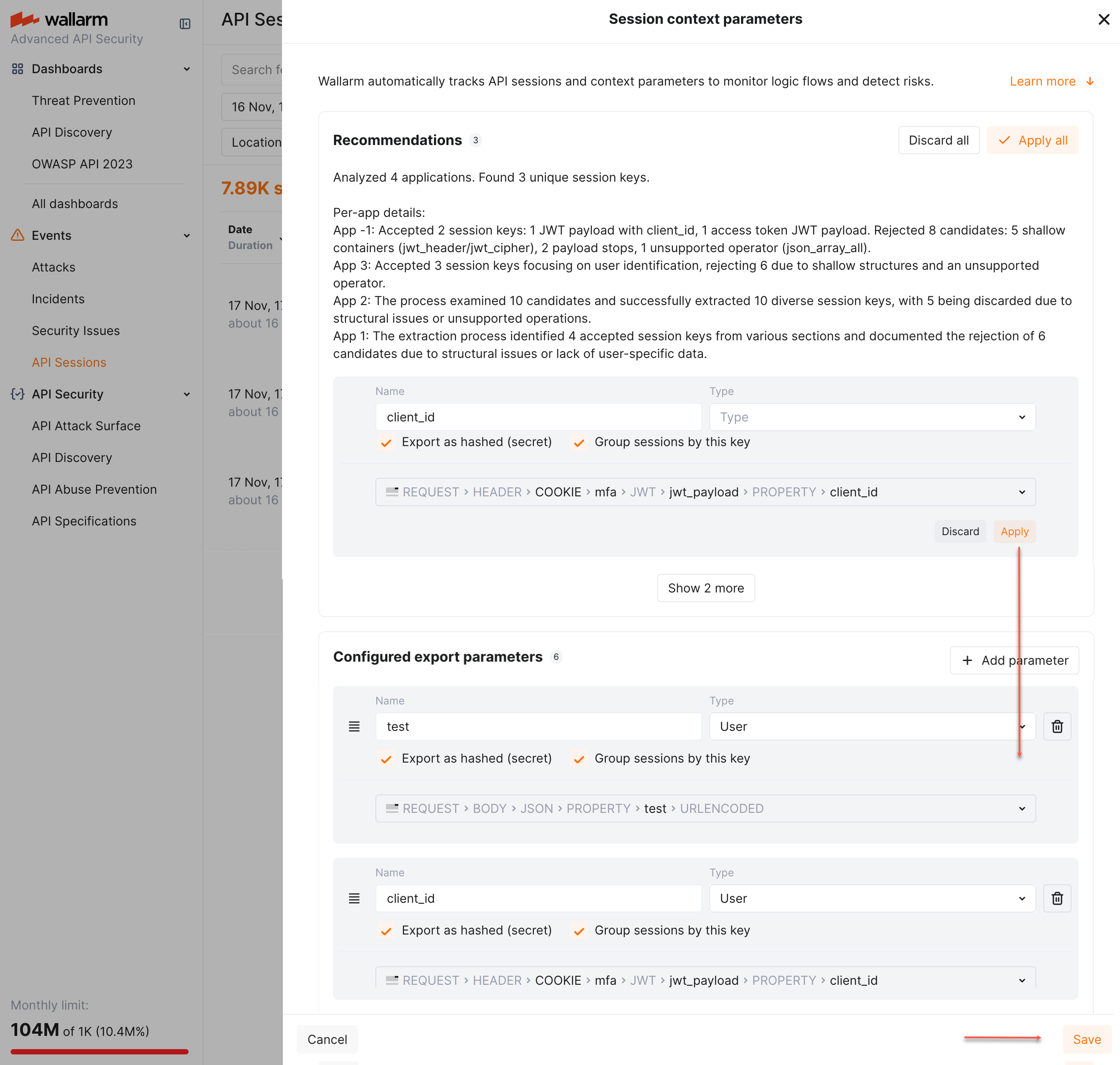 Based on your traffic, Wallarm suggests parameters you might want to use as session grouping keys: